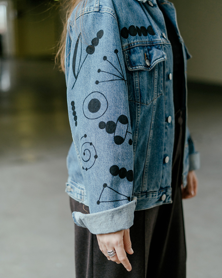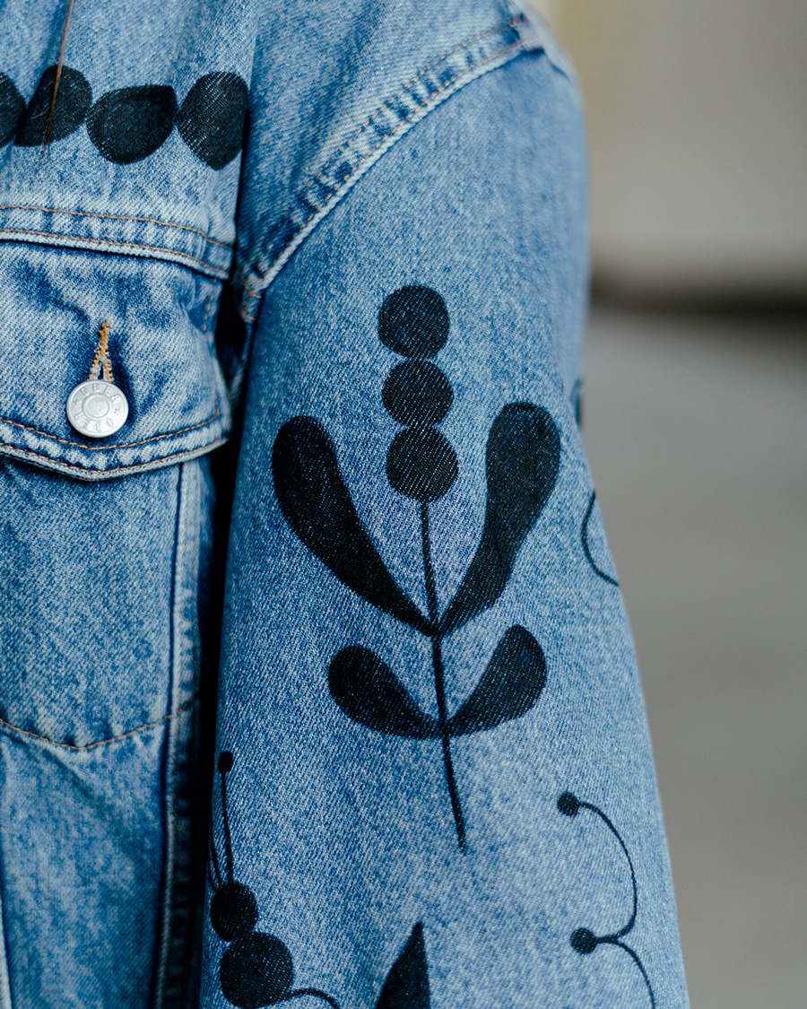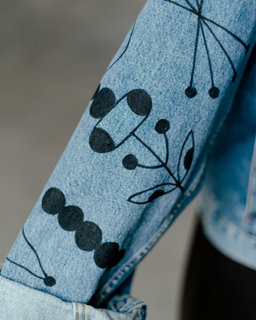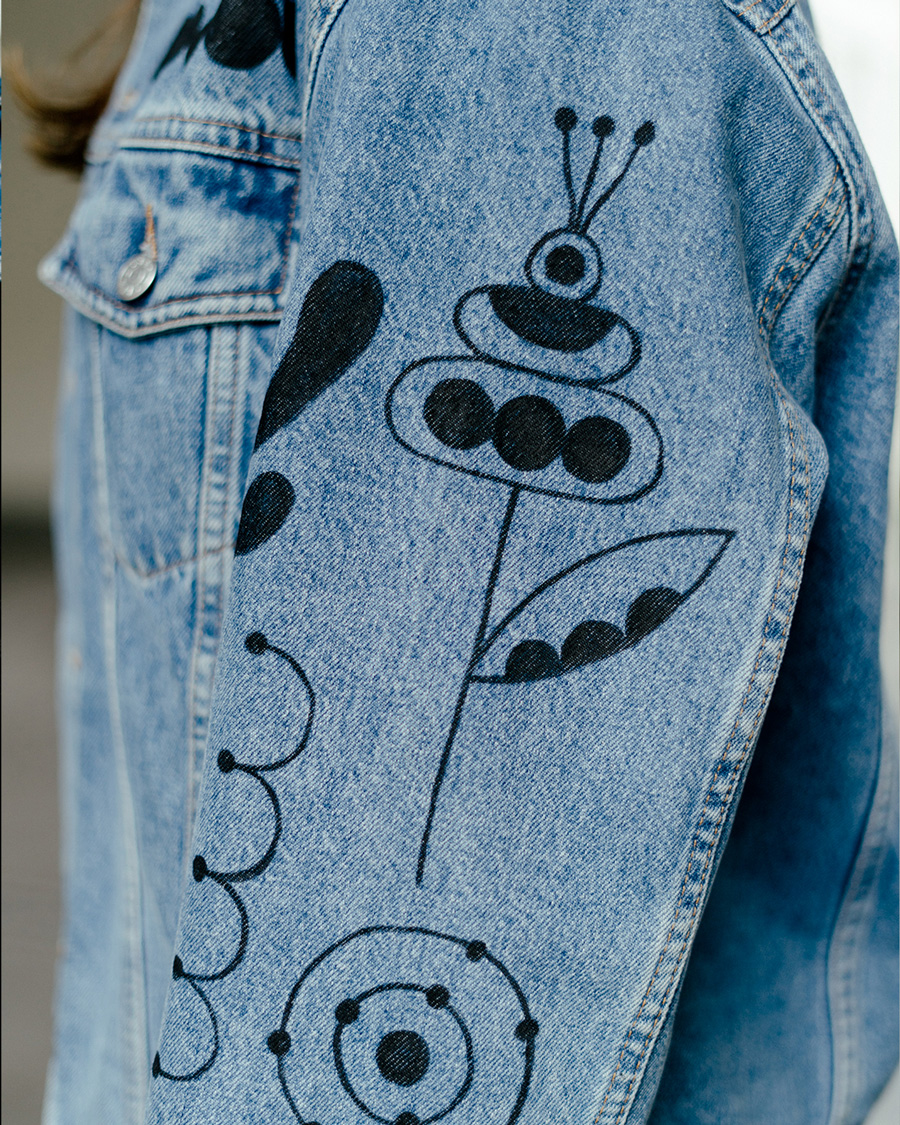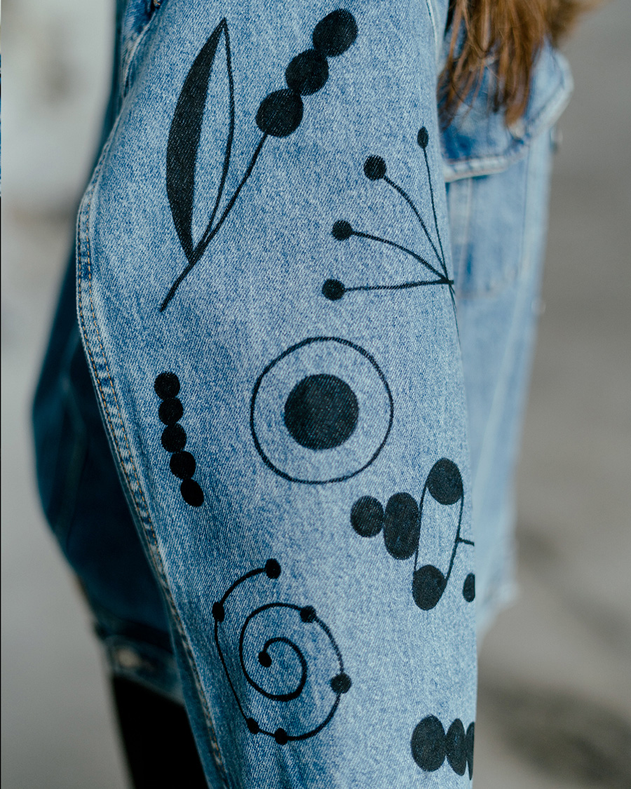 Veste en jean chinée, décorée à la main avec mes petits motifs graphiques et fleuris.